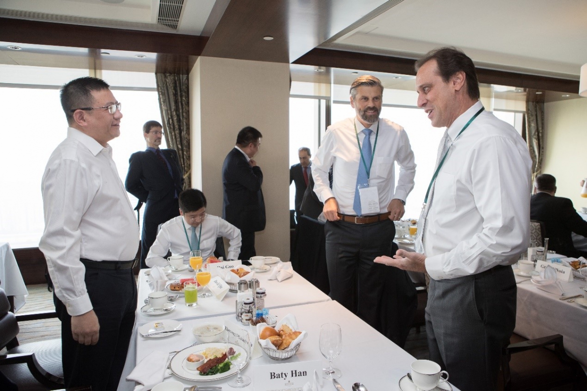 丹納赫水質(zhì)集團(tuán)-大中華區(qū)銷售副總裁秦曉培(左一)與Greg DiNoia特潔安全球市政銷售副總裁(右一)及Torsten Hahr哈希全球產(chǎn)品事業(yè)部過程解決方案總監(jiān)(中)在交流會上